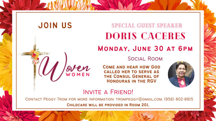 Come and hear how God called Doris Caceres to serve as the Consul General of Honduras in the RGV. Invite a friend!