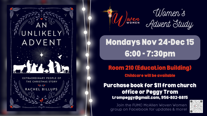 Our Woven Women's ministry will be doing an Advent book study on "An Unlikely Advent: Extraordinary People of the Christmas Story" by Rachel Billups every Monday from November 24 through December 15, from 6:00-7:30pm in Room 210 in the Education Building. Childcare will be available.