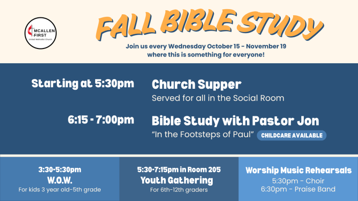 Every Wednesday from October 15 through November 19, join us on Wednesday at 6:15pm for Bible Study with Pastor Jon called "In the Footsteps of Paul." Childcare will be available from 6-7pm.
