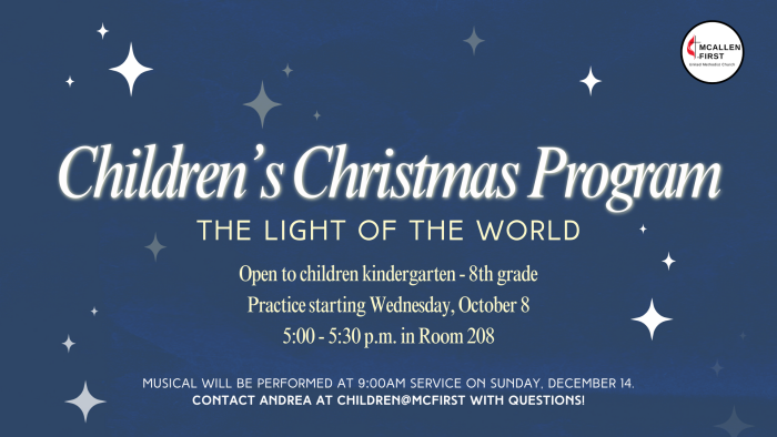 Our Children's Christmas Program is open to children kindergarten through 8th grade. Practice starts Wednesday, October 8, from 5:00 to 5:30pm in Room 208. The program will be performed at the 9:00am service on Sunday, December 14.