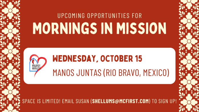 Join us on mission to Rio Bravo, Mexico, to work with Manos Juntas! Space is limited, and you can email Susan at shellums@mcfirst.com to sign up.