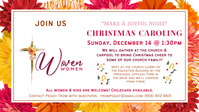 All women and kids are welcome to join for "Make a Joyful Noise" Christmas Caroling!