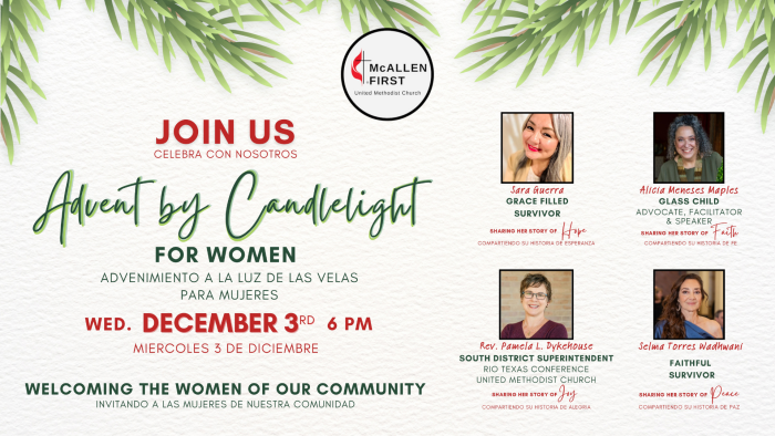 Celebra con nosotros Advenimiento a la Luz de las Velas para Mujeres el miercoles 3 de diciembre a las 6pm en la Primera Iglesia Metodista de McAllen!
