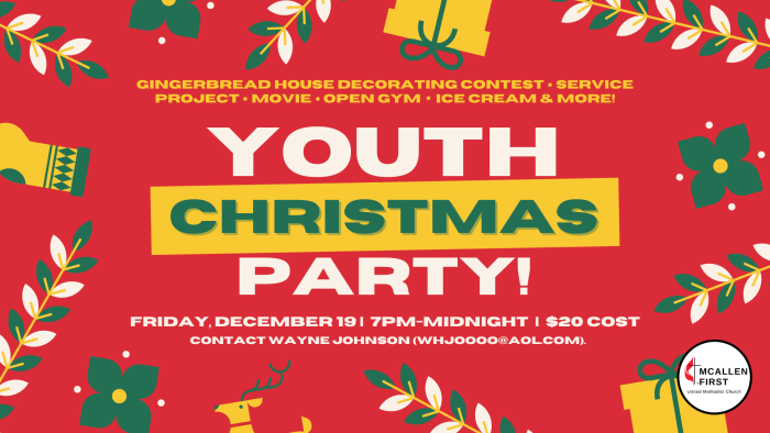 Our Youth Christmas Party for all 6th-12th graders will take place on Friday, December 19, from 7pm to midnight. The cost is $20, and activities will include a gingerbread house decorating content, a service project, a movie, open gym time, ice cream, and more!