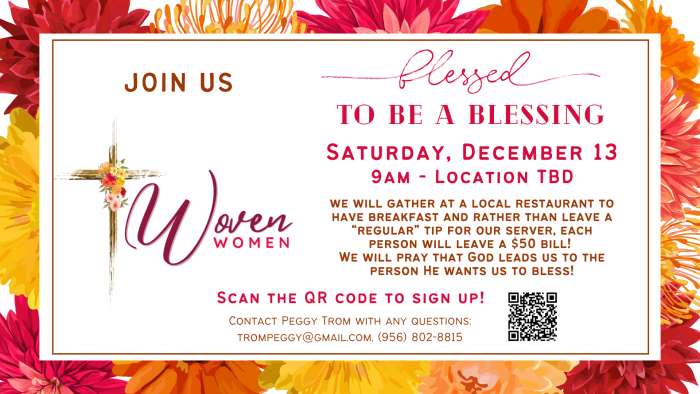 Women, join us on Saturday, December 13, at 9am for "Blessed to be a Blessing." We will gather at a local restaurant to have breakfast and rather than leave a “regular” tip for our server, each person will leave a $50 bill! We will pray that God leads us to the person He wants us to bless! Click the button below to sign up. If you have questions, contact Peggy Trom at trompeggy@gmail.com or (956) 802-8815.