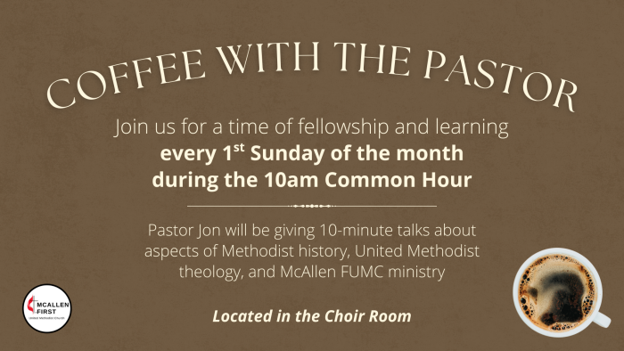 Join us for a time of fellowship and learning every 1st Sunday of the month during the 10am Common Hour. Pastor Jon will be giving 10-minute talks about aspects of Methodist history, United Methodist theology, and McAllen FUMC ministry. We'll be meeting in the Choir Room.