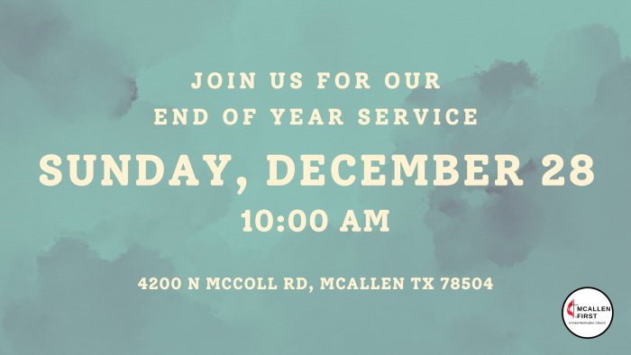 One ServiceDecember 28, 2025 10:00amAddress: First United Methodist Church, McAllen, 4200 N. McColl Rd., McAllen, TX US 78504Room: SanctuaryAdd to Calendar