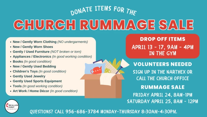 From April 13-17, we'll be collecting items from 9am-4pm in the church gym. If you have any questions, contact the church office at 956-686-3784.