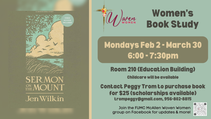 Our Woven Women's ministry will be starting a new study on Monday, February 2. In this 9-week study, author Jen Wilkin will navigate the sermon on the mount as it was originally heard. Come and learn from Jesus, just as His disciples did.
