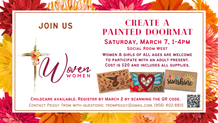 Our Woven Women's ministry will be hosting "Create a Painted Doormat" on Saturday, March 7, from 1-4pm in Social Room West.