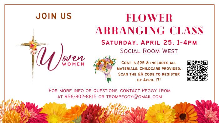 Women, join us for our Flower Arranging Class on Saturday, April 18, from 1 to 4pm, in Social Room West. The cost is $25 and includes all materials. Childcare is available.