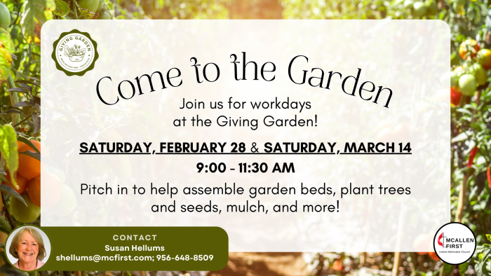 Join us for a workday at the Giving Garden! Pitch in to help assemble garden beds, plant trees and seeds, mulch, and more! Contact Susan Hellums at shellums@mcfirst.com with any questions.