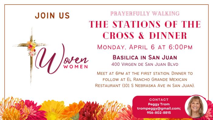 Join the Woven Women's ministry on Monday, April 6 to prayerfully walk the Stations of the Cross at the Basilica in San Juan, followed by dinner together.
