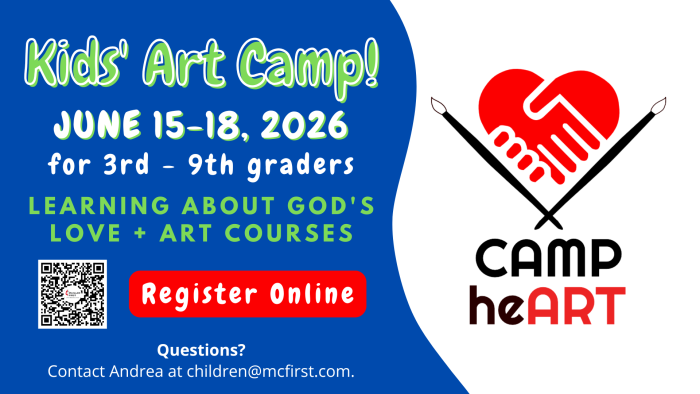 This year's Camp heART will take place June 15-18 from 8:30am-12:30pm. It is open to all children entering 3rd through 9th grade in the fall of 2026. The fee is $35 (cash or check), which includes snacks and materials for all courses.