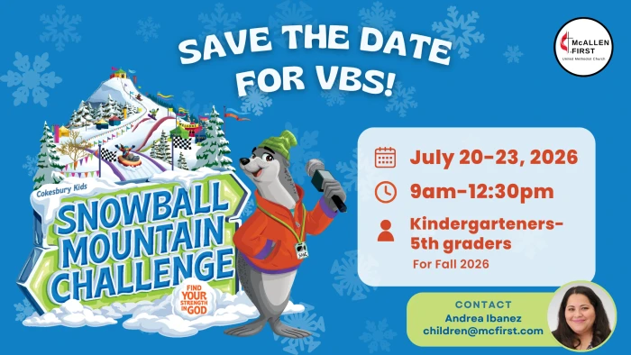 SAVE THE DATE: Vacation Bible School will be July 20-23, 2026, from 9am-12:30pm. VBS is open for kindergarteners through 5th graders (as of Fall 2026).
